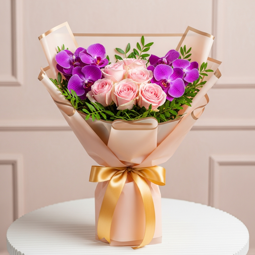 Imagine the delight of receiving this captivating arrangement. The square presentation immediately sets it apart, creating a visually stunning display of floral artistry. Three purple orchids stand tall, complemented by five romantic pink roses. The light peach wrapping enhances the colors, while the lush green Murraya leaves add a touch of natural elegance. This bouquet offers a unique combination of colors and textures that will leave a lasting impression.