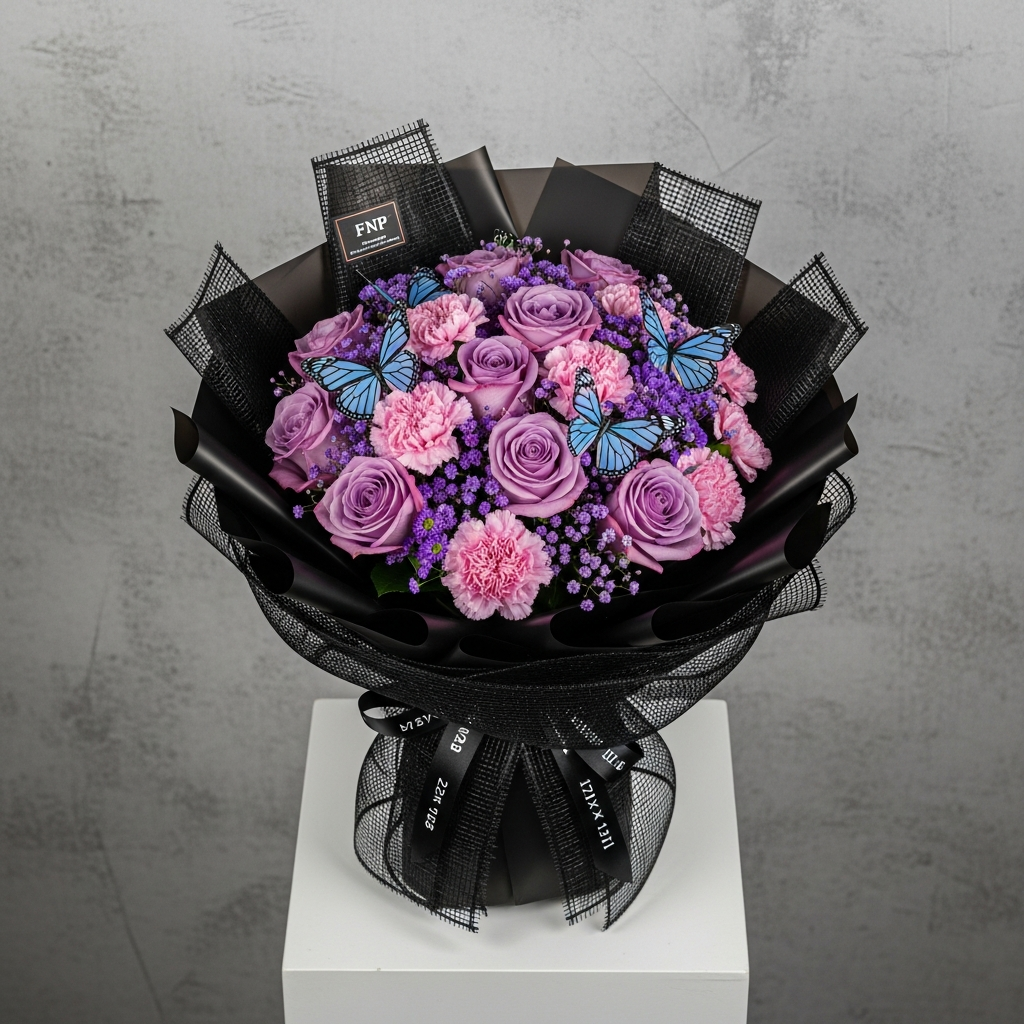 Imagine the delighted gasp as they lift the lid. A vibrant symphony of purples unfolds – the deep, velvety roses contrasting with the lighter, frothier carnations and wispy limonium. The bouquet’s modern styling, with its black mesh wrap and whimsical butterfly accents, adds a touch of contemporary flair, making it far more visually exciting than a standard supermarket bunch.